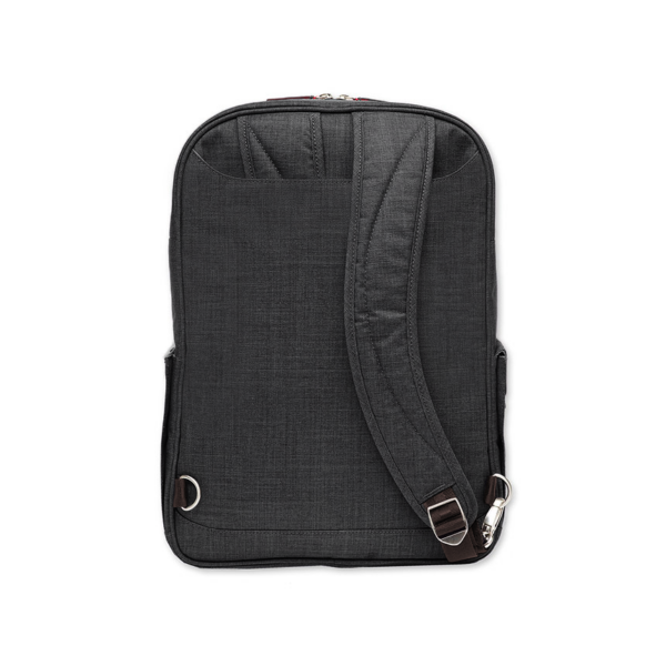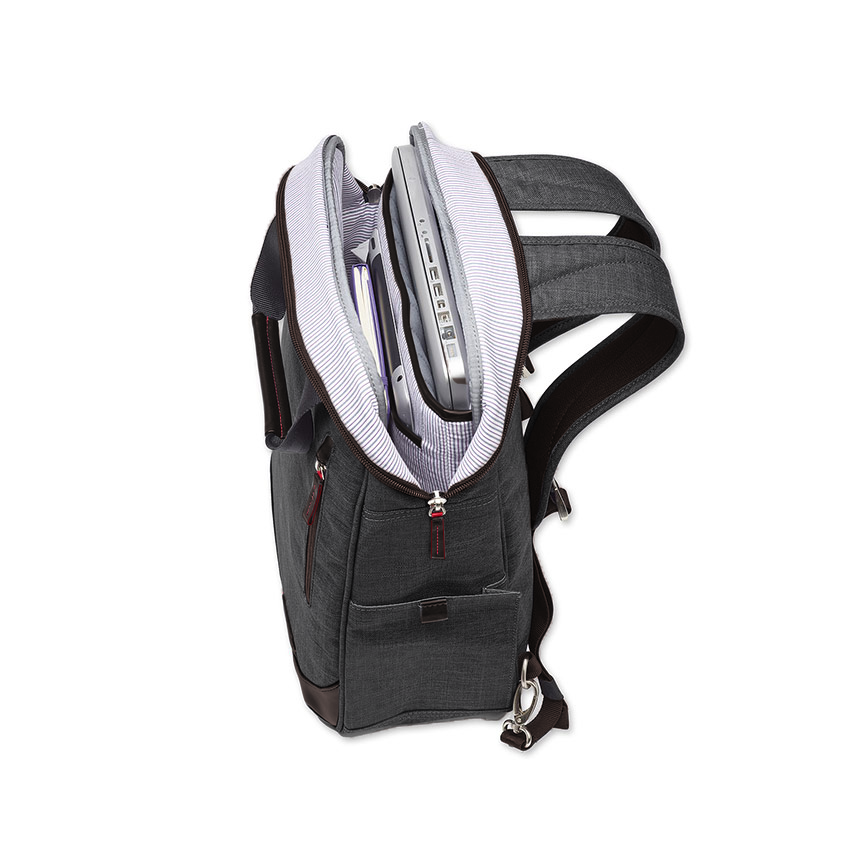 - Tuckaway straps that convert from backpack to tote bag Internal accessory panel